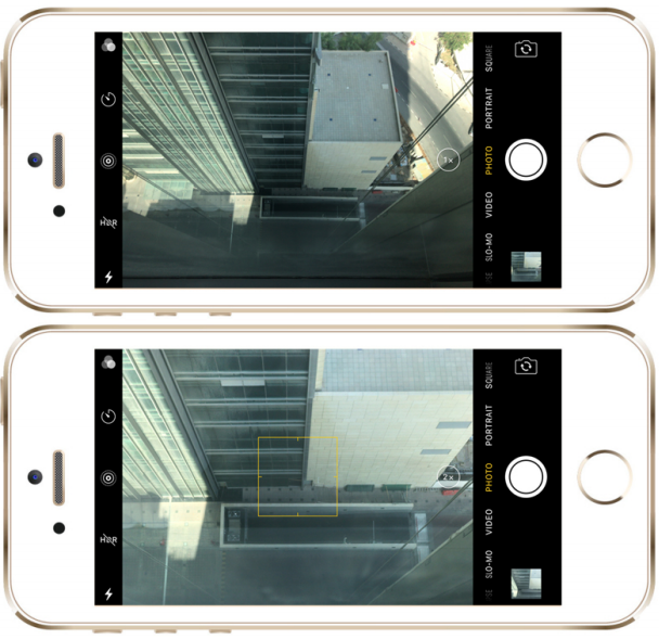 Nas imagens abaixo, a imagem superior (1x) está usando a câmera grande angular e a imagem inferior (2x) está usando a câmera telefoto no iPhone 7 Plus. Para trocar de câmeras, basta tocar no círculo com 1x/2x ao lado do botão de foto/obturador.