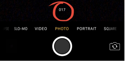 Modo Burst: Semelhante a uma câmera DSLR, seu iPhone é capaz de tirar várias fotos por segundo. Para acessar esse recurso, basta pressionar e manter pressionado o botão do obturador. Você verá o número de imagens capturadas ao lado do botão do obturador (destacado aqui em vermelho).