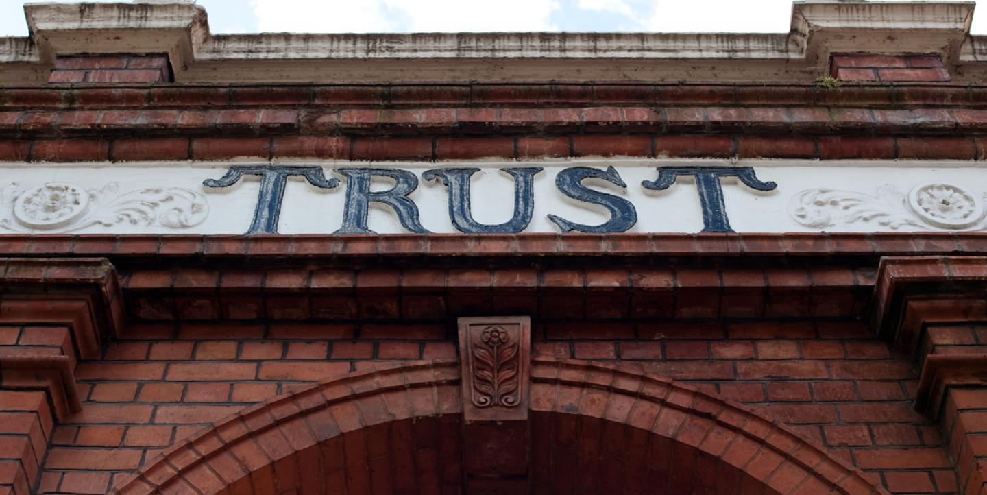 تصویری از نمای ساختمانی که روی آن واژه «اعتماد» به چشم می خورد، تصویر از پوینتر